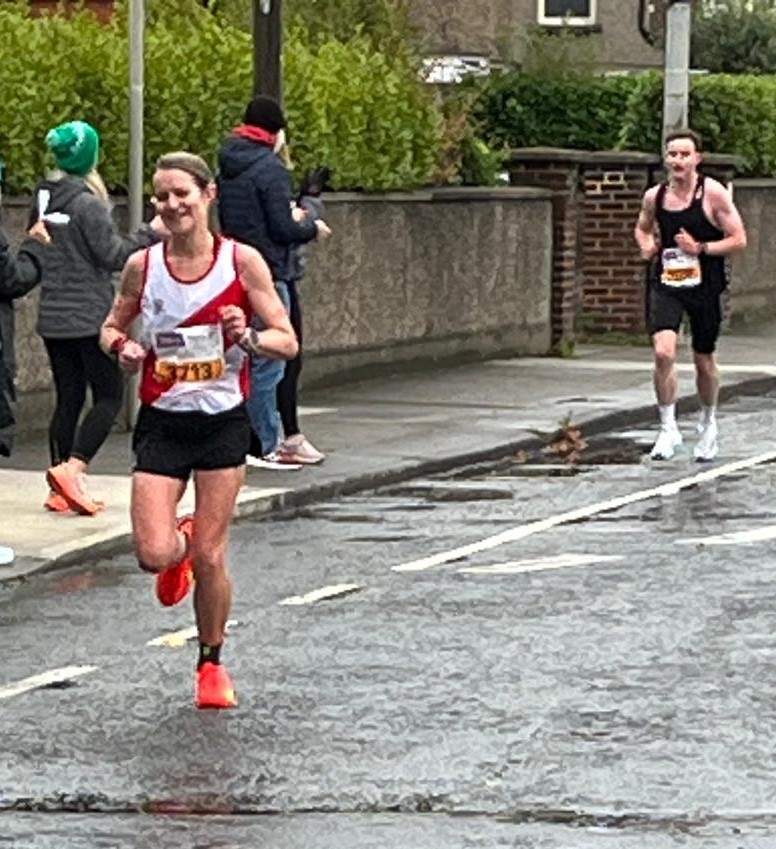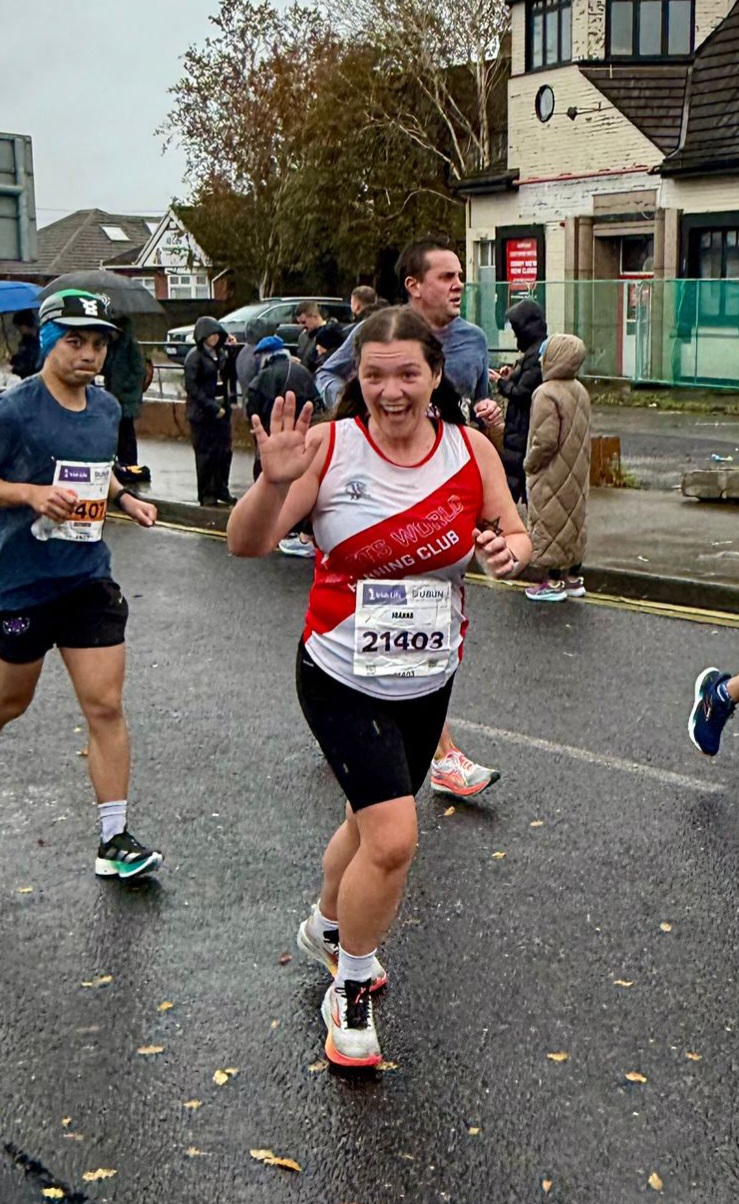 I hadn’t run Dublin Marathon since 2017 (i.e. before children) and it was always on the cards; having run the Dublin Race Series half in 2024 I got the offer of a place and snapped it up. The other motivation that I had was to enjoy it as I have suffered and complained my way through many races and particularly marathons in the past. I set out to do so and had a fantastic time! The morning was freezing but setting off it was mostly perfect weather [aside from Crumlin, which was savage]. I stayed a bit ahead of the 4 hours 40 pacers for most of the race (from bitter experience – do not run behind pacers on a windy day unless being smacked in the face by a balloon is your idea of a good time). Phoenix Park is always a highlight, and I was happy to note that animals still escape from the zoo to cheer the runners on. We did have to contend with a coach throwing himself midstream to take photos of “his” runners at one point, though! Parts I enjoyed more than last time I ran it: Stoneybatter (the support!); Knockmaroon Hill (nice and calm, also downhill); Terenure (always a highlight but the absolute best spot now thanks to my husband and kids being out, my 38-weeks-pregnant friend staying to hold up a sign despite the weather, and of course the Sportsworld support, and in particular to the ray of sunshine that is Marian who ran with me through the village). Parts I had forgotten are horrible: the rain really (really) came out in Crumlin which was tough, and the UCD flyover was the point where I started to forget my “why” (very much reflected in my splits falling off here)! But before you know it you’re back in the safety of Ballsbridge and flying over the finish line (although my friend was quick to point out, on video, that I stopped running IMMEDIATELY on crossing the finish line). Reg being at the baggage claim was a welcome sight too! I had a PB of 9 minutes, finishing in 4 hours 47, so I am absolutely delighted with that. I seem to have shifted from “never again” to “if I do two more I’ll have done ten” pretty quickly, so watch this space…